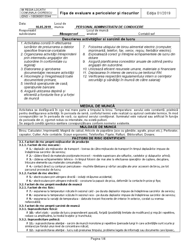 Fisa De Identificare A Factorilor De Risc Profesionale Director