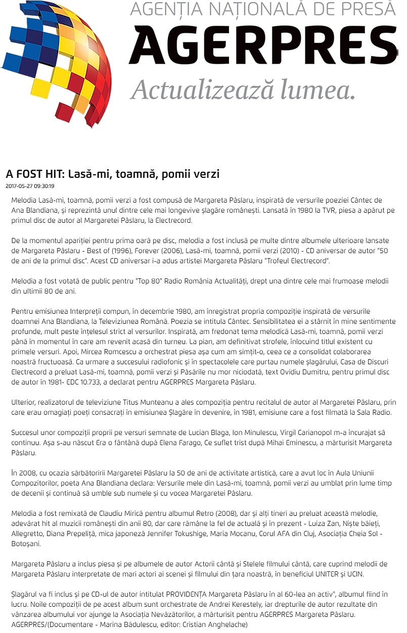 Margareta Paslaru Deruleaza 62 De Ani Creativi Pe Multiple Planuri Arhiva 2014 Versuri Ana Blandiana Lasa Mi Toamna Pomii Verzi Margareta Paslaru A Compus Muzica In 1980