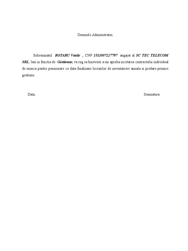 Model Cerere Incetare Contract De Munca Word