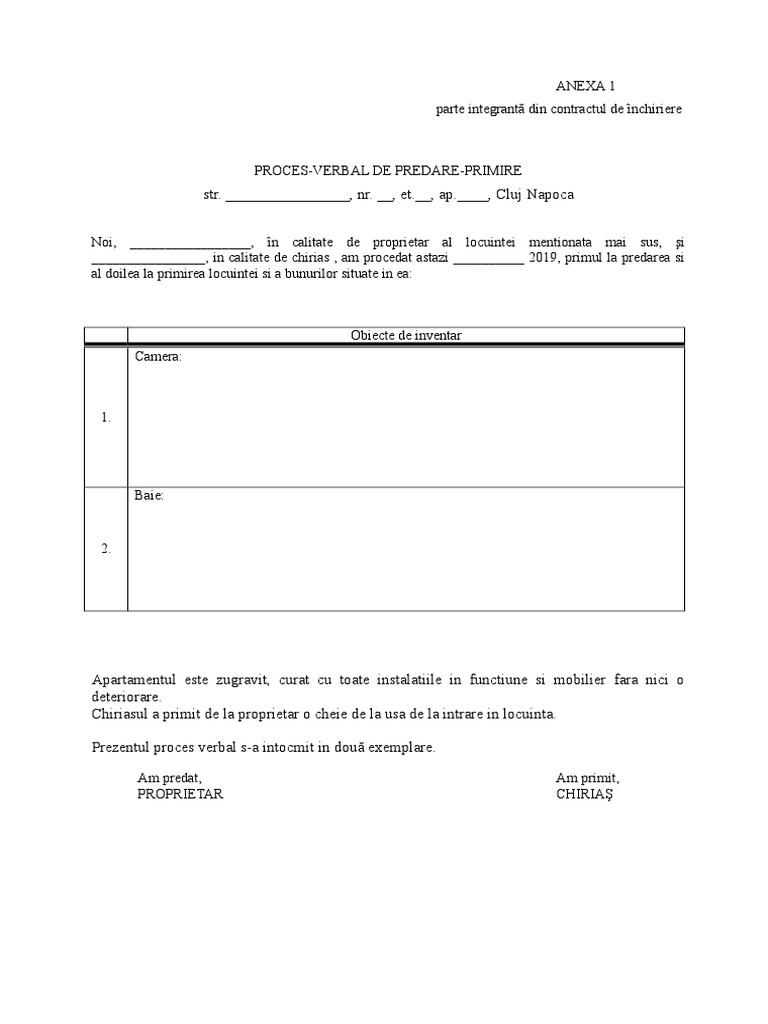 Proces Verbal De Predare Primire Apartament Docx U2022 U2022 Anexa 1 Parte Integrant U0103 Din Contractul De U00eenchiriere U2022 U2022 Proces Verbal De Course Hero