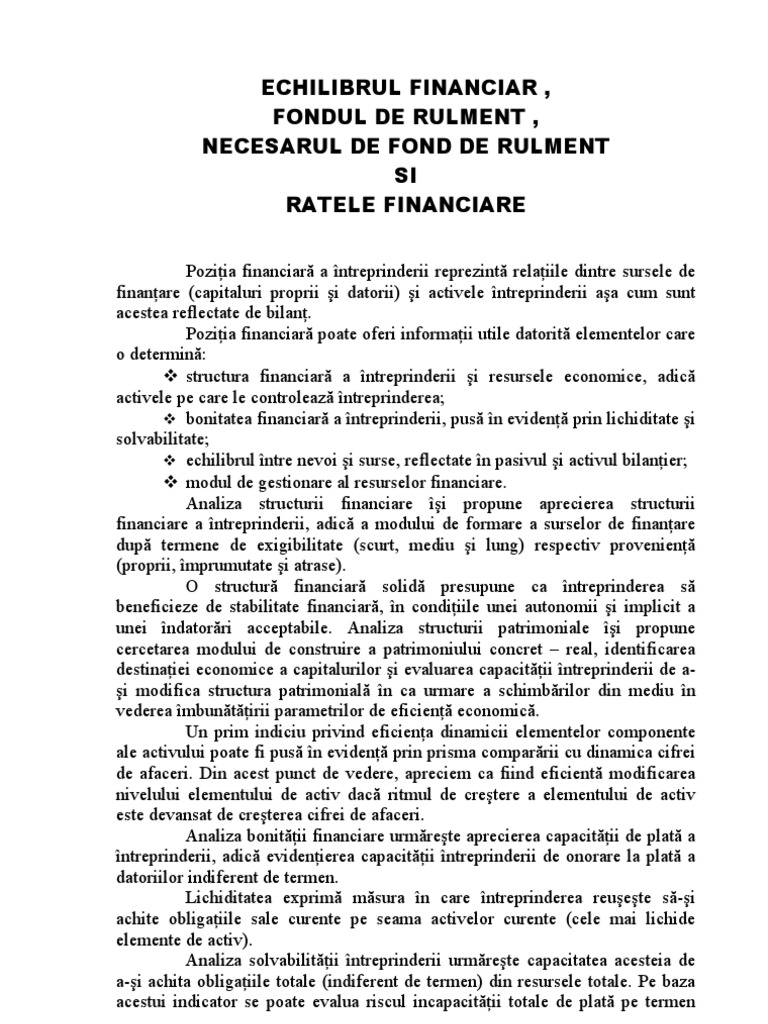 Echilibrul Financiar Fondul De Rulment Si Ratele Re